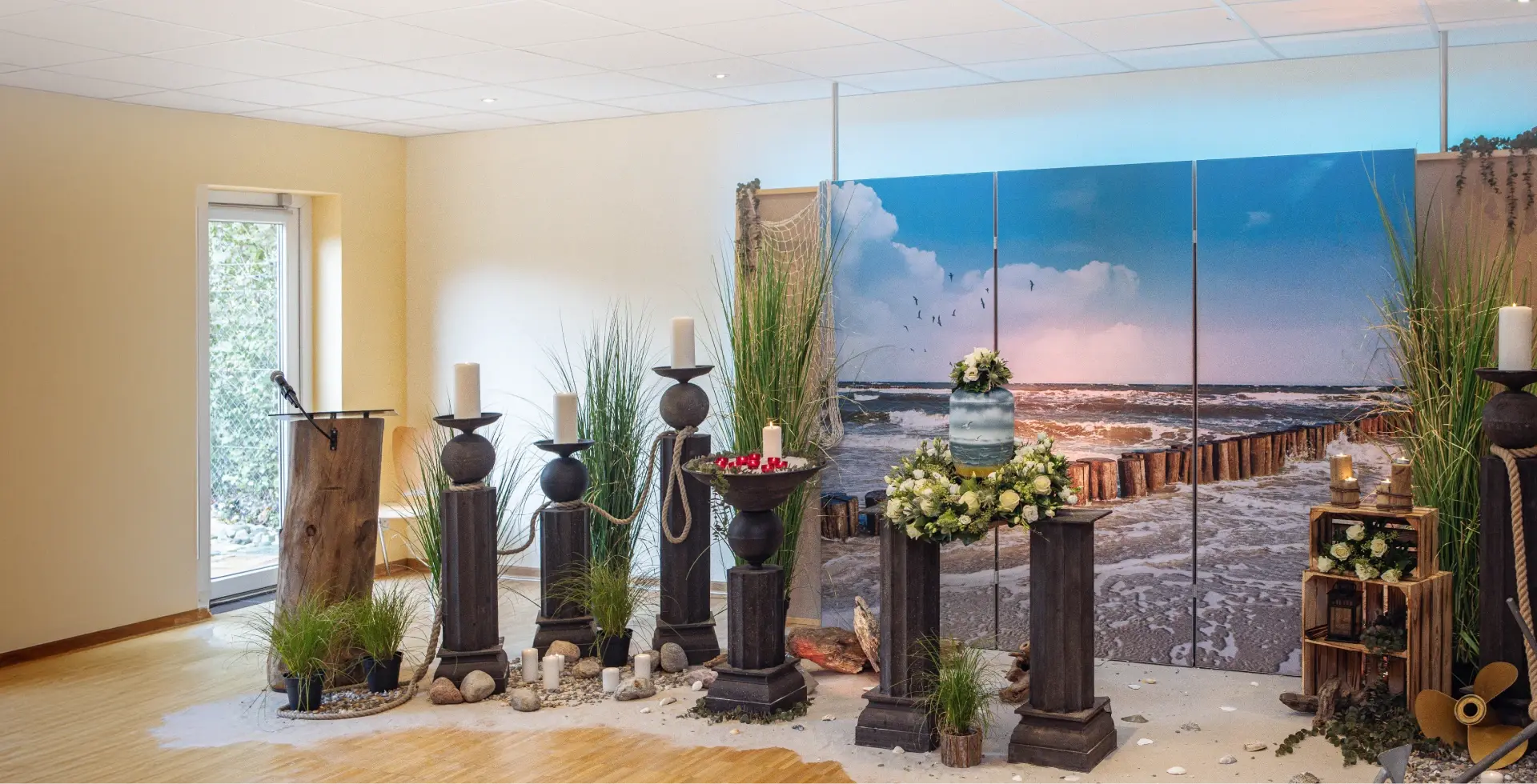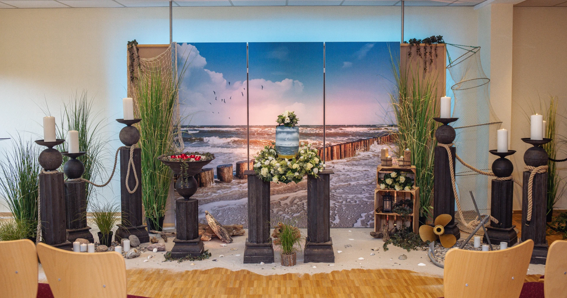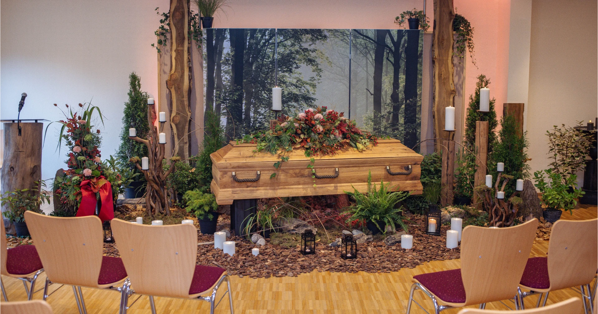 Mehr Raum für die Erinnerung: Mit einer individuellen Trauerdekoration entsteht ein besonderer Rahmen für das Gedenken. Die Möglichkeiten heute sind vielseitig. Besondere Themendekorationen: Interessen und Vorlieben des Verstorbenen können innerhalb der Gestaltung unterstrichen werden. Ein eigenes Möbelstück, eine inszenierte Gartenlandschaft, die Angelausrüstung oder eine Nähmaschine verleihen der Atmosphäre eine persönliche Note. Für alle, die sich mit ihrem Beruf oder Hobby identifizieren – auch das kann hier Ausdruck finden.