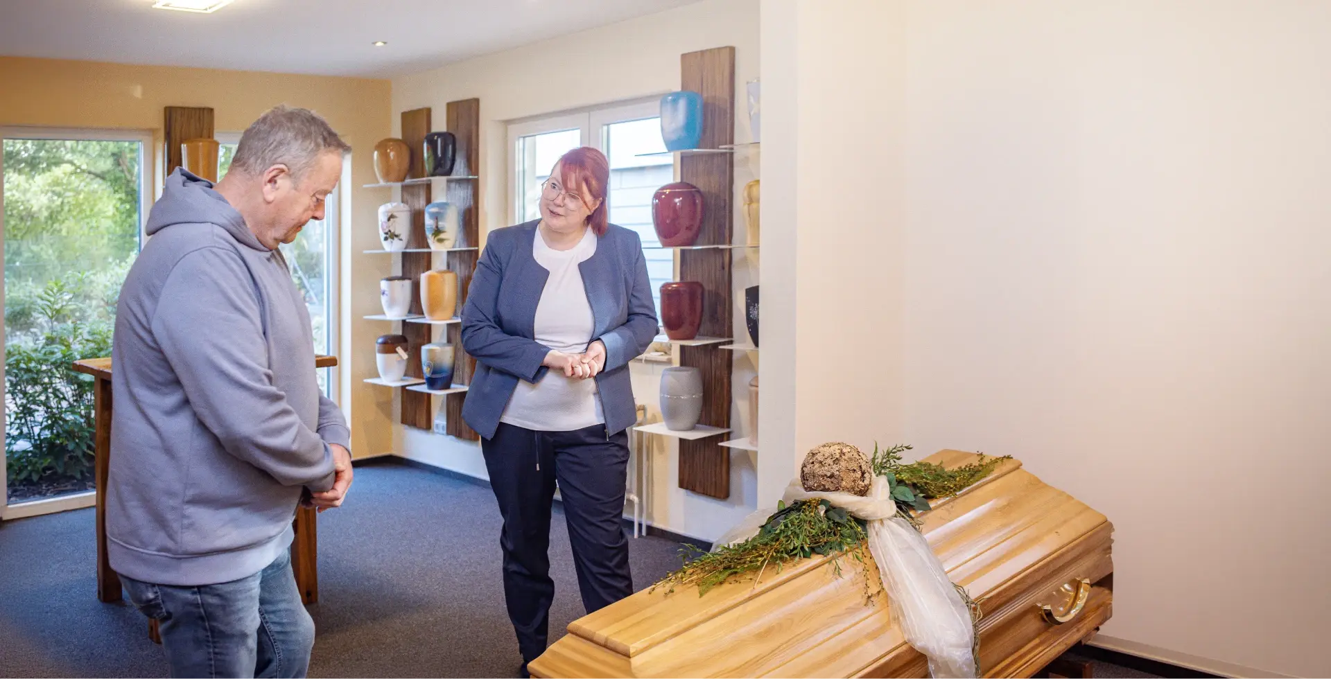 Särge und Urnen gibt es in unterschiedlichen Ausführungen. In unserem Ausstellungsraum präsentieren wir Ihnen ein ausgewähltes Sortiment, darunter auch Trauerwäsche und besondere Erinnerungsschmuckstücke oder Gedenklichter. Sie möchten lieber in Ruhe zu Hause Ihre Auswahl treffen? In unserem Katalog finden Sie einen guten Überblick zu unseren Angeboten und viele Anregungen für eine individuelle Trauerfeier. Nehmen Sie sich gern Zeit für Ihre Entscheidung. Bei allen Fragen sind wir für Sie da.