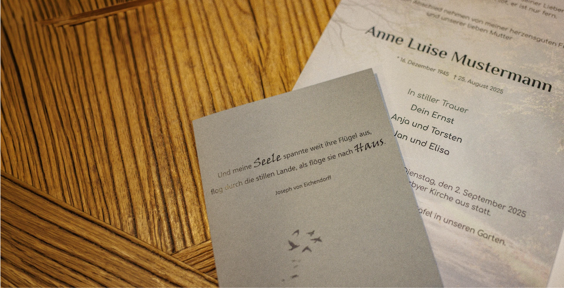 Drucksachen im Trauerfall sind wichtige Erinnerungsdokumente. Die Gestaltung von Trauerkarten, Todesanzeigen, Danksagungen und Jahrgedächtnissen kann ganz individuell erfolgen: Zur Auswahl stehen unterschiedliche Formate, Schriftarten, Motive und Symbole sowie religiöse oder weltliche Zitate. Ob schlicht oder aufwendig, ob traditionell oder modern: Gern zeigen wir Ihnen diverse Muster und Möglichkeiten. Gleichzeitig sorgen wir für den zeitnahen Versand und die Veröffentlichung in der von Ihnen gewünschten Zeitung.